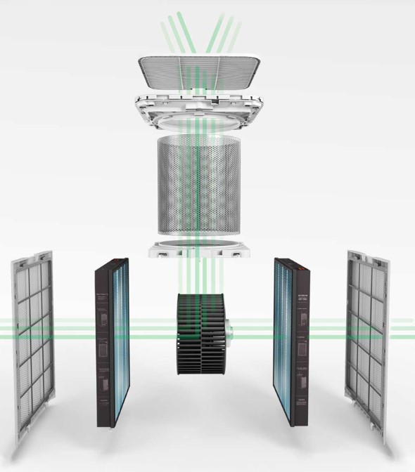 Очиститель захватывает воздух со всех сторон, что способствует лучшему и более качественному очищению без сквозняков. Мощная система фильтров устраняет пыль, органические загрязнения, дымовые частицы, неприятные запахи, примеси опасных газов, ядовитые вещества.